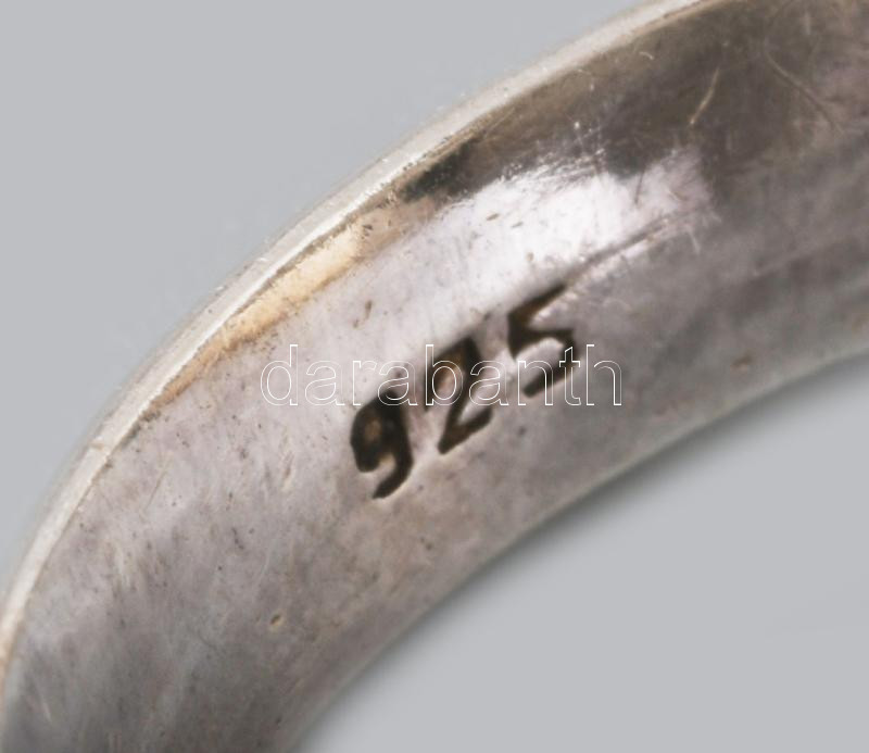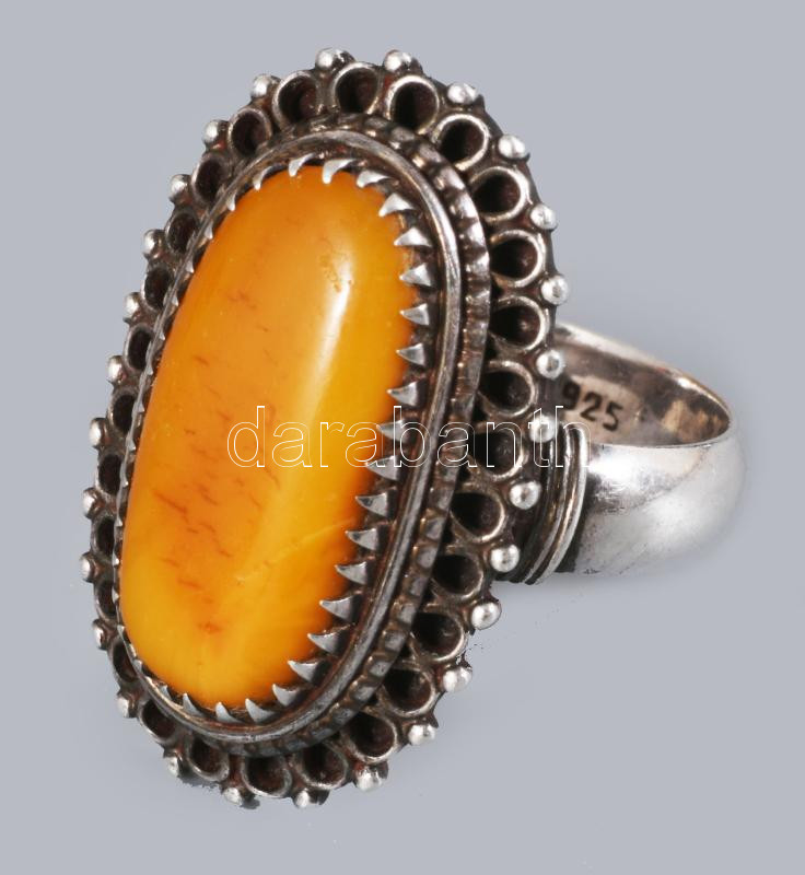 Ezüst (Ag) gyűrű, borostyán berakással, jelzett, m:59, bruttó 9,2g