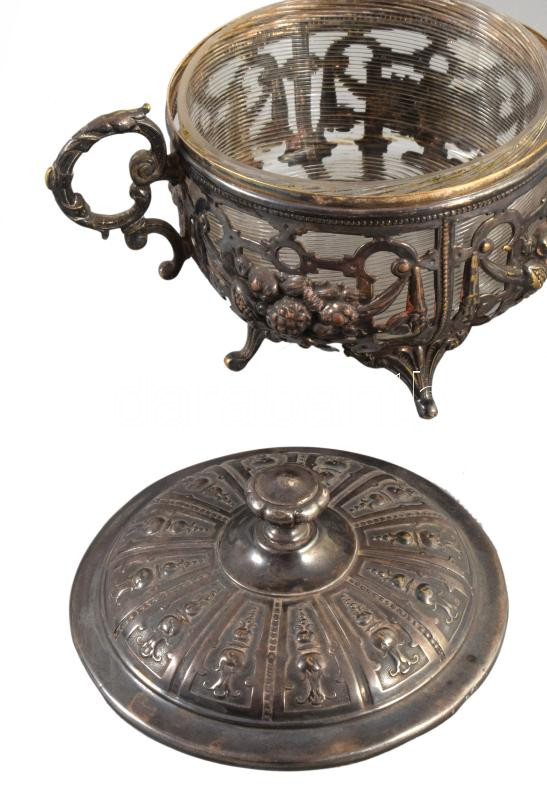 Antik áttört mintás ezüstözött cukortartó, üveg betéttel, 18x12 cm