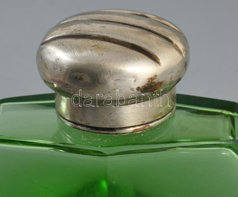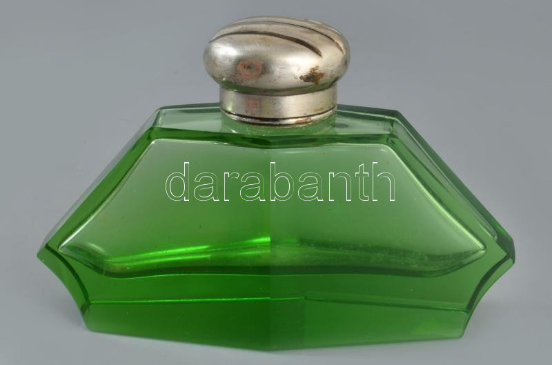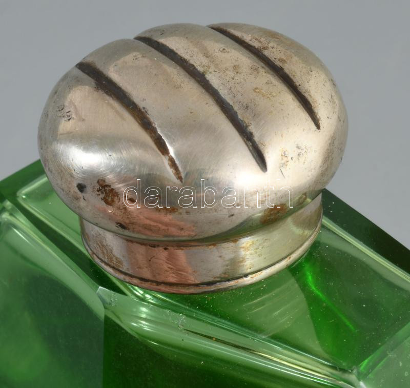 Art deco parfümös üveg, ezüst (Ag) kupakkal és zárórésszel, 13x8 cm