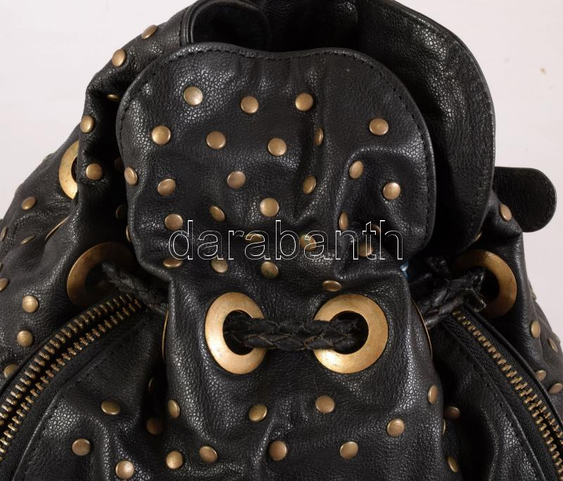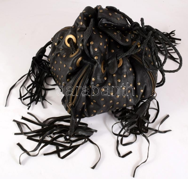 Egyedi fekete kerek válltáska, szegecselt díszítéssel.
