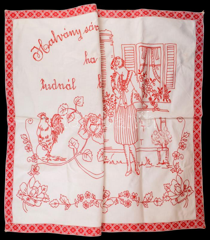 Kézzel hímzett konyhai falvédő, "Halvány sárga rózsa ha tudnál beszélni" felirattal, 66x78 cm