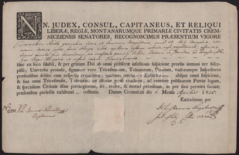 1820 Útlevél Körmöcbánya (Kreminca SK) városa által kiállítva. 36x24 cm