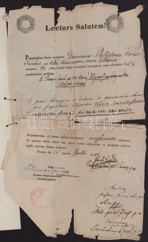 1854 Izraelita orvostanhallgató egyetemi bizonyítvány a pesti egyetemről, megviselt állapotban, szignettával, hozzá a magyar fordítás,