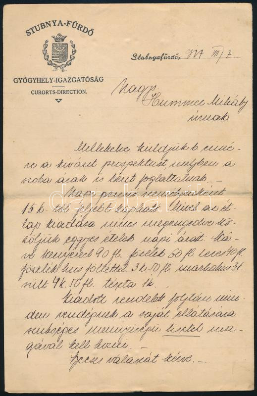 1917 Stubnyafürdő gyógyhely igazgatójának kézzel írt levele fejléces levélpapíron