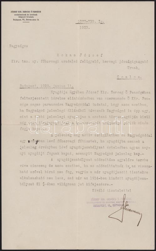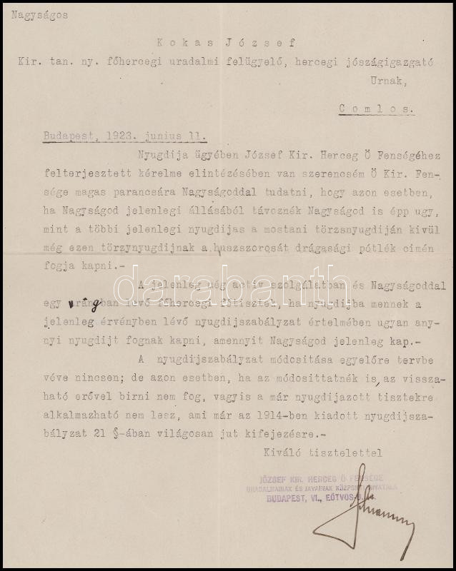 1923 József főherceg intézőjének levele Kokas József főhercegi intézőnek