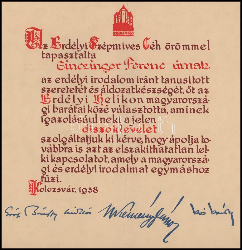 1938 Kolozsvár, az Erdélyi Szépmíves Céh által kiállított oklevél neves emberek nyomtatott aláírásával (pl. Kós Károly)