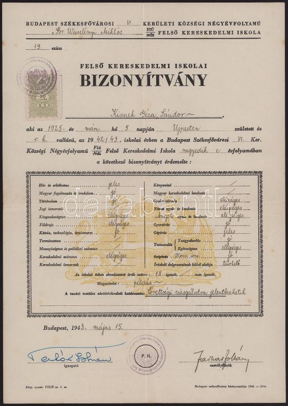 1943 Bp., Báró Wesselényi Miklós Felső Kereskedelmi Iskola bizonyítványa, 50f okmánybélyeggel, jó állapotban