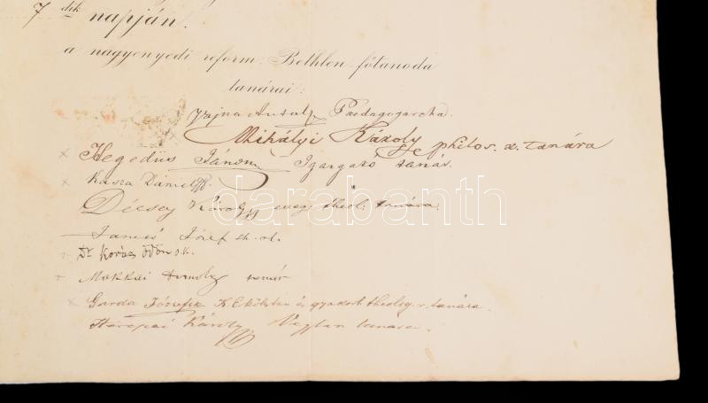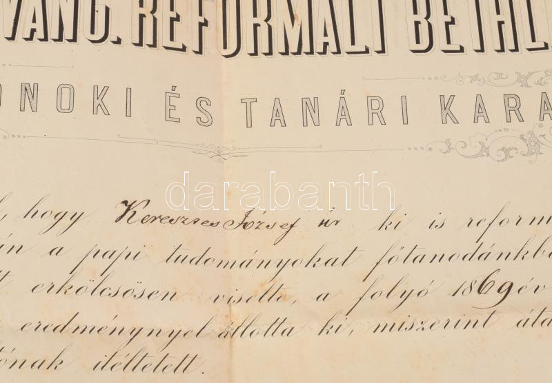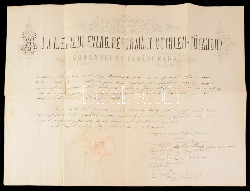 1869 A Nagyenyedi Evangélikus Reformált Bethlen Főtanoda dekoratív metszett fejlécű bizonyítványa Keresztes József későbbi nagyenyedi tanár és egyházi író papi tanulmányai elvégzéséről a tanári kar sk. aláírásával, szárazpecséttel, hajtva, jó állapotban