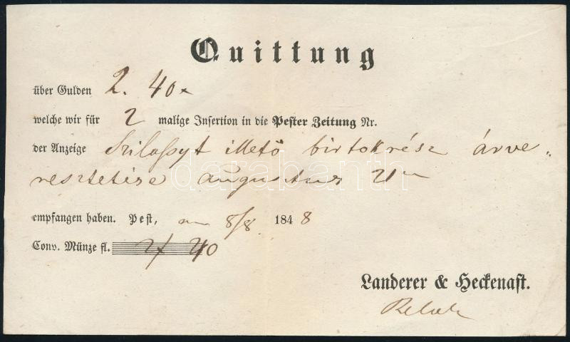 1848 Pest, Landerer és Heckenast által kiállított nyugta hirdetés befizetéséről