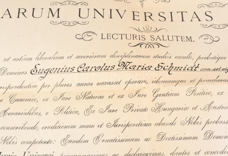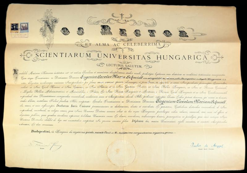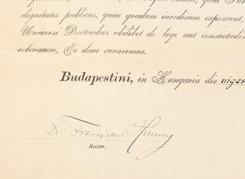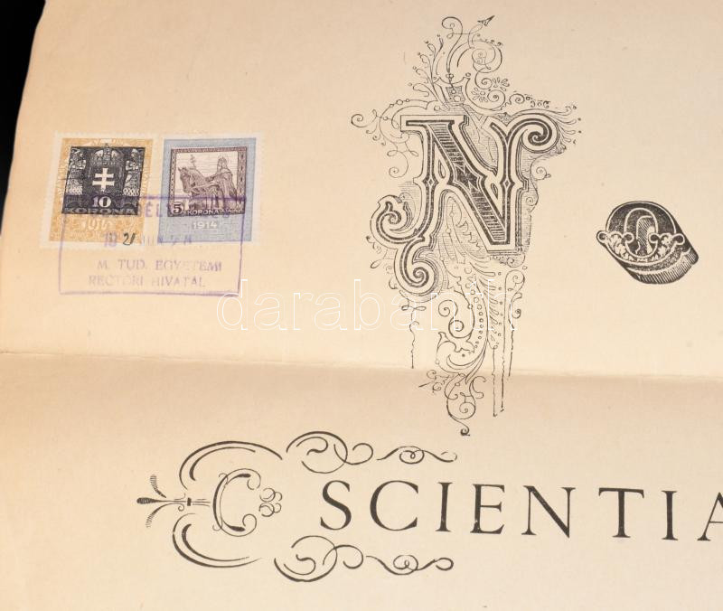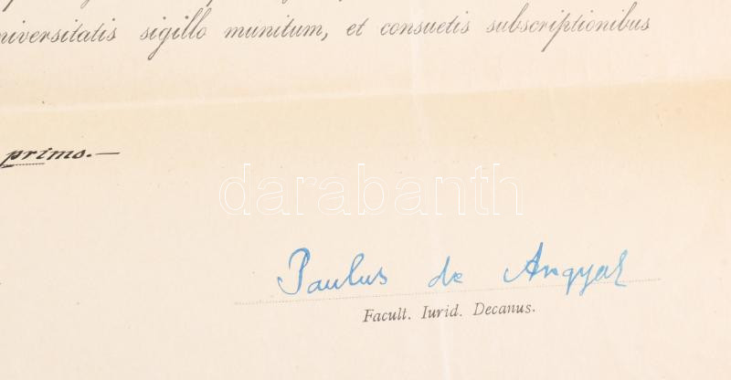 1921 Bp., a Pázmány Péter Tudományegyetem által kiállított jogi doktori diploma, Hanuy Ferenc (1867-1953) rektor és síkabonyi Angyal Pál (1873-1949) jogász, dékán aláírásával, 10+5K okmánybélyeggel, papírfelzetes pecséttel, 51x67 cm