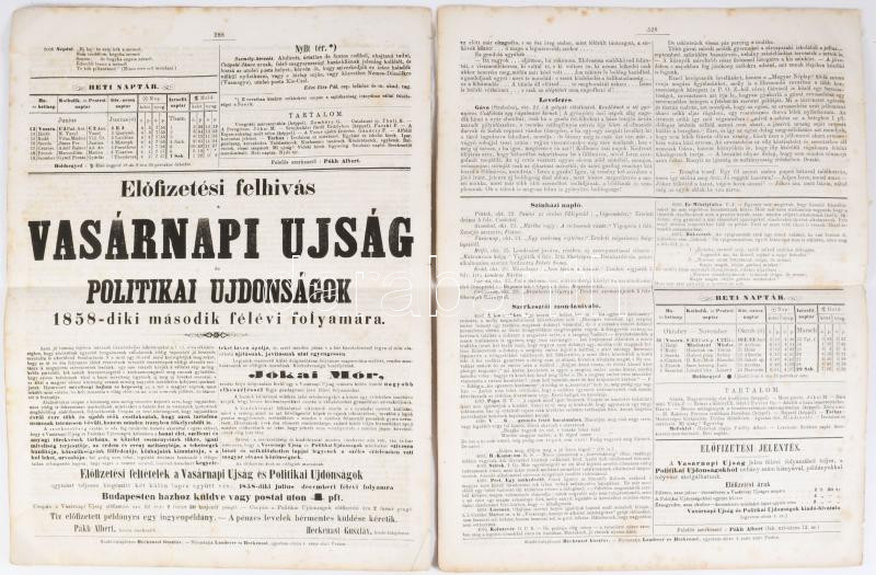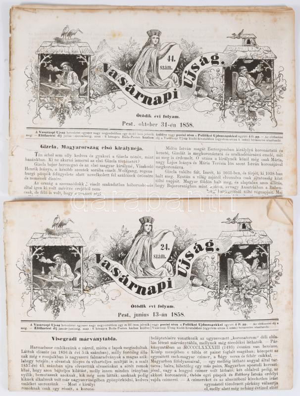 1858 Vasárnapi Ujság V. évf. 24. sz. és 44. sz. (2 db), kiadó-tulajdonos: Heckenast Gusztáv, Pest, Landerer és Heckenast-ny., kissé foltos, sérült, 12 p., 12 p.