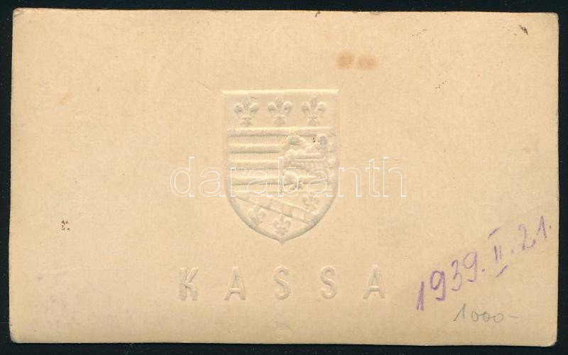 1939 A kassai székesegyházat (Szent Erzsébet-dóm) ábrázoló keményhátú kép, a hátoldalon Kassa dombornyomott címerével, 6x10 cm