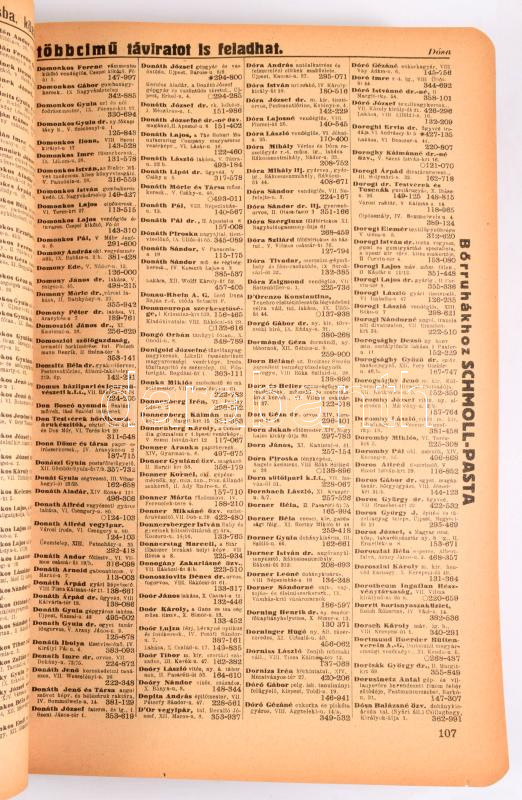 1943 A Budapesti Egységes Hálózat (Budapest és környéke) betűrendes távbeszélő névsora és távbeszélő szaknévsora. Bp., 1943., A M. Kir. Postavezérigazgatóság, (Pallas-ny.), XXVIII p.+1 t.+2+615+1 p.+1 t.+ 404 p.+2 sztl. lev. Korabeli reklámokkal. Kiadói papírkötésben.