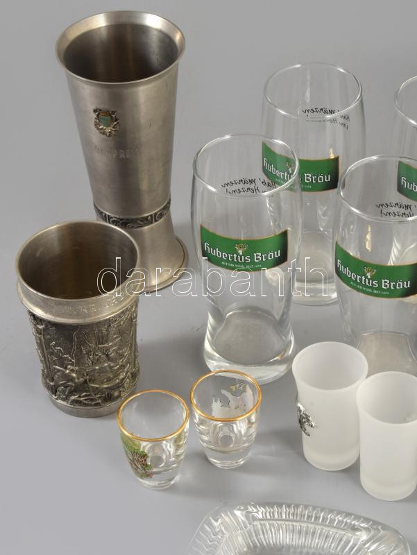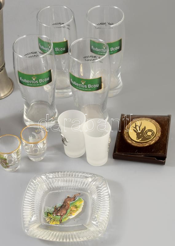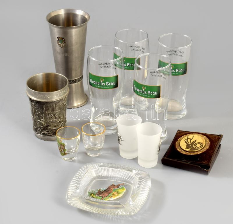 12 darabos zömmel vadász stílusú tárgy tétel, közte poharak, hamuzó, kitüntetés.