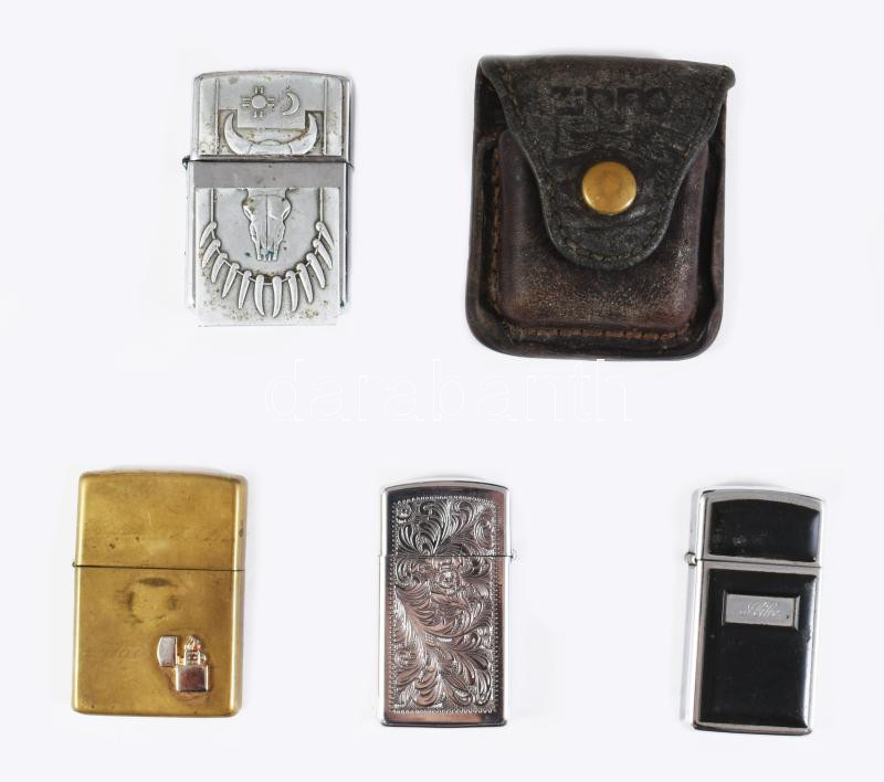 4 db régebbi Zippo öngyújtó, az egyik bőr tokkal, változó állapotban, nem működnek
