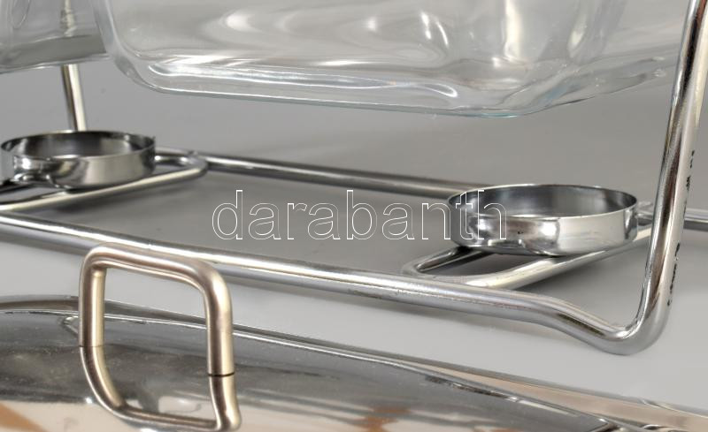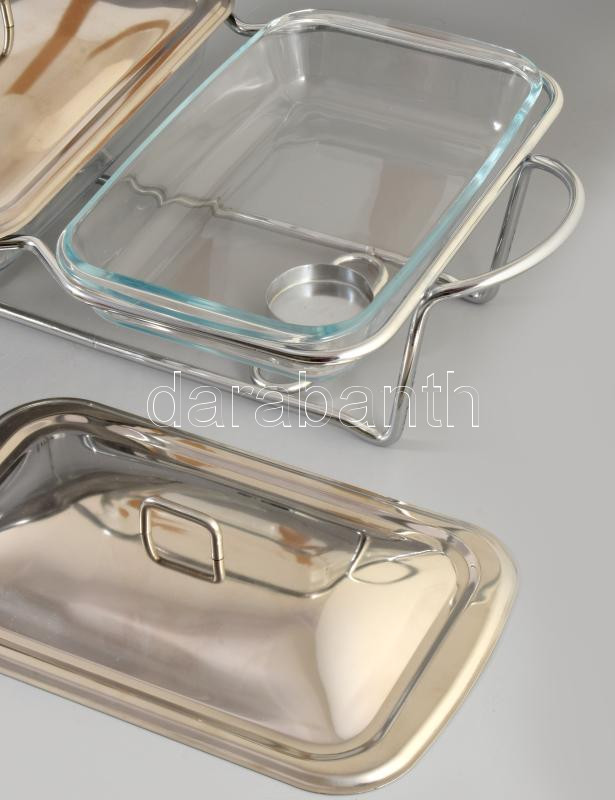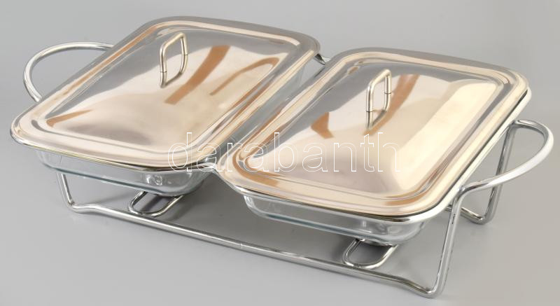 Kéthelyes melegítős ételszervírozó, fém fedőkkel és szerelékkel, újszerű, 50x30 cm