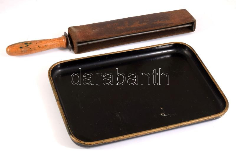 Régi tálca és fenőszíj, h: 21-28 cm