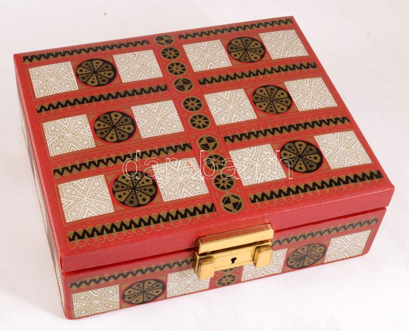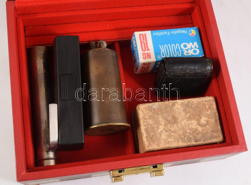 Vegyes bolha tétel, közte töltényből készült öngyújtó, szájharmonika, filmnegatív, borotvaélező, stb., bőrborítású díszdobozban.