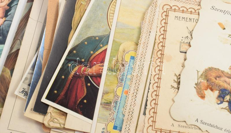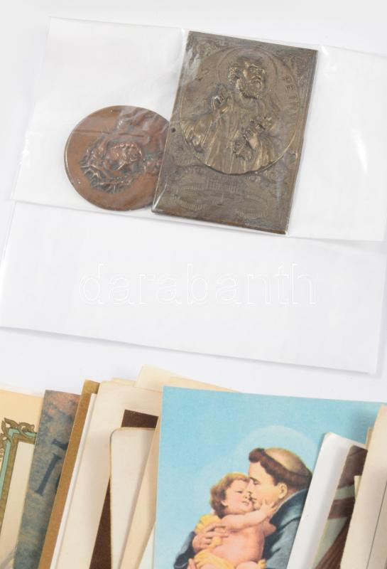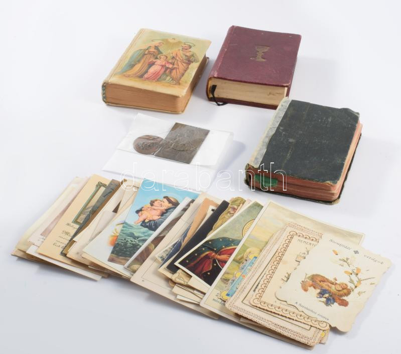Vegyes vallási tétel: szentképek + 3 db imakönyv + 2 db fém érem/plakett