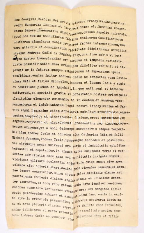 1645 A Csele család Rákóczi Ferenc által adott nemesi címeres levelének 1700-as évekbeli másolata , valamint magyar fordítása.