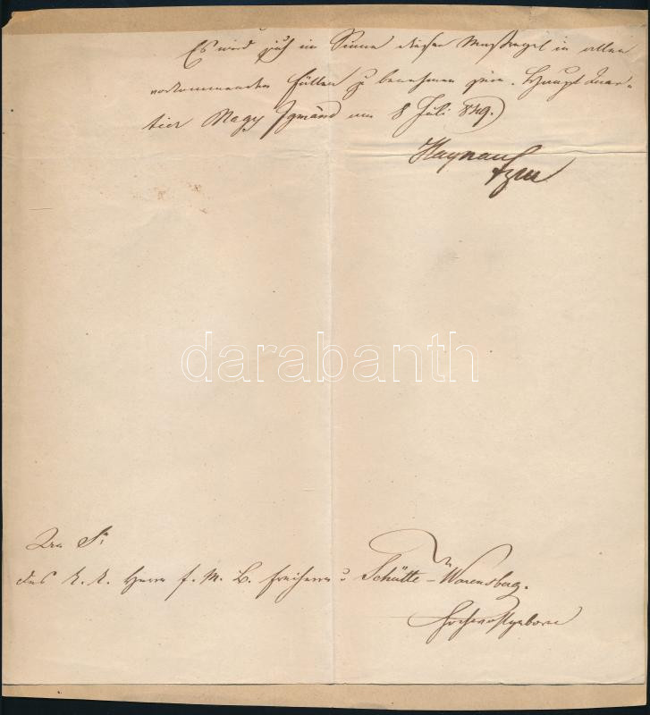 1849. július 8. báró Julius Haynau táborszernagy (1786-1853) autográf aláírása levélrtőredéken. Nagyigmándról.