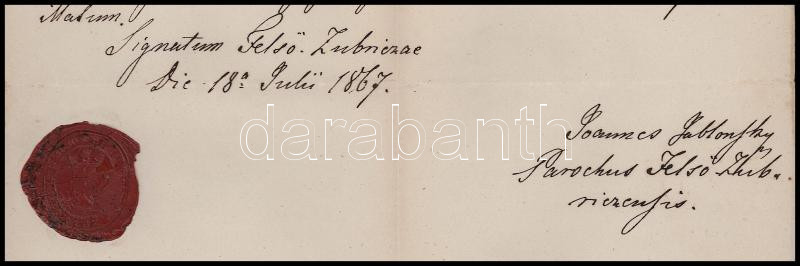 1867 Felsőzubrica (ma Zubrzyca Górna, Lengyelország) Magyar királyság legészakibb települése, anyakönyvi kivonat, a falu plébánosának pecsétjével. illetékbélyeggel
