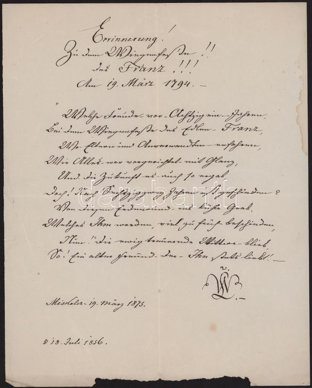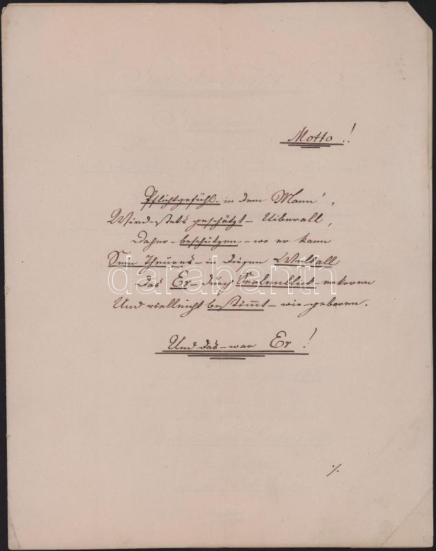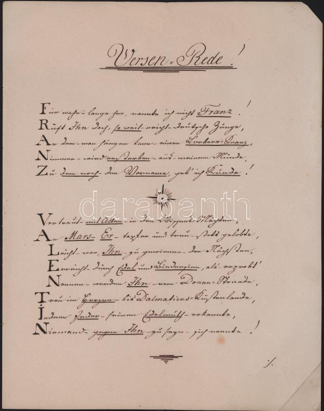 1871 Emléklap WIlhelm bon Lalanczy nyugalmazott őrnagytól Franz von VAlentin csendőrtiszt emlékére aki Sauerbrunnban (Slavnik, SK) hunyt el .Utána lapon anagramma Franz Valentin nevével, egy lapon anagramma Euphrosina von Szed nevével 7 beírt oldal