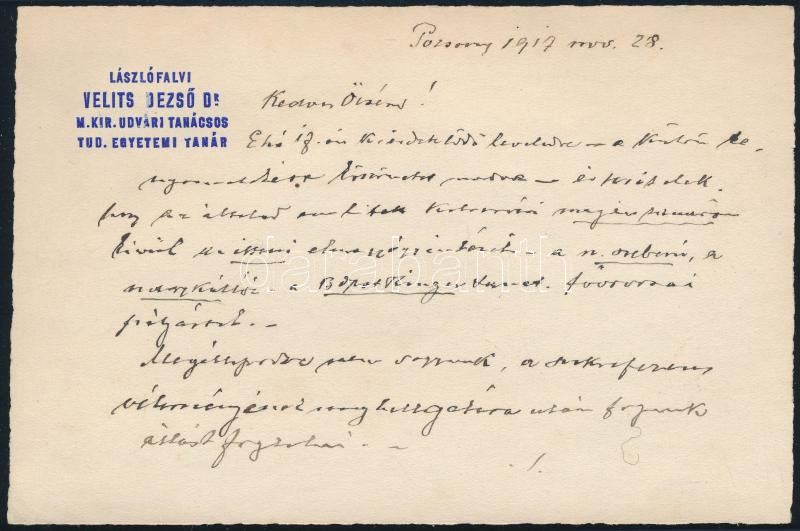 1917 Lászlófalvi Velits Dezső (1860-1921) pozsonyi (Felvidék) orvos, szülész-nőgyógyász, Semmelweis Ignác tanítványa, a pozsonyi bábaképző és később az állami kórház igazgatója, egyetemi tanár saját kézzel írt és aláírt levele kartonján, két megírt oldal, szép állapotban
