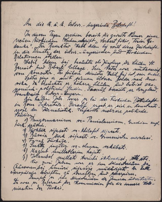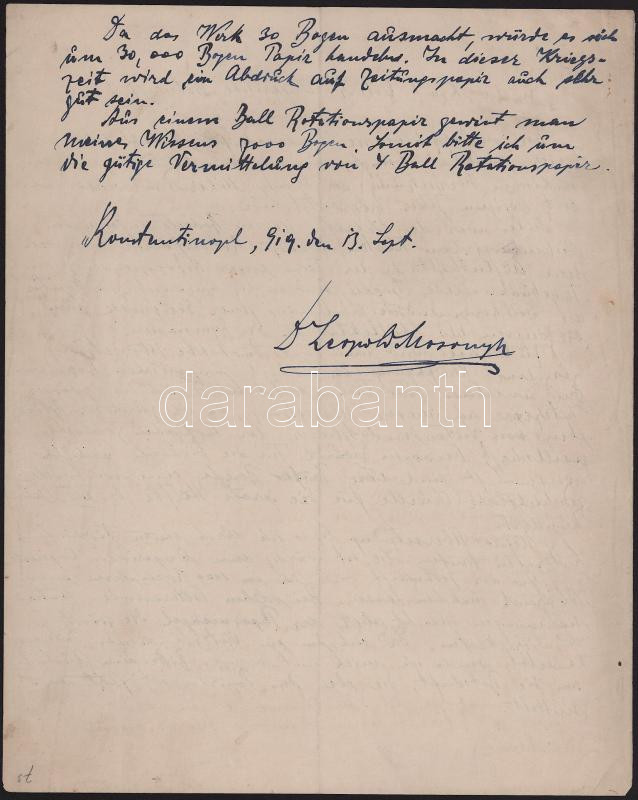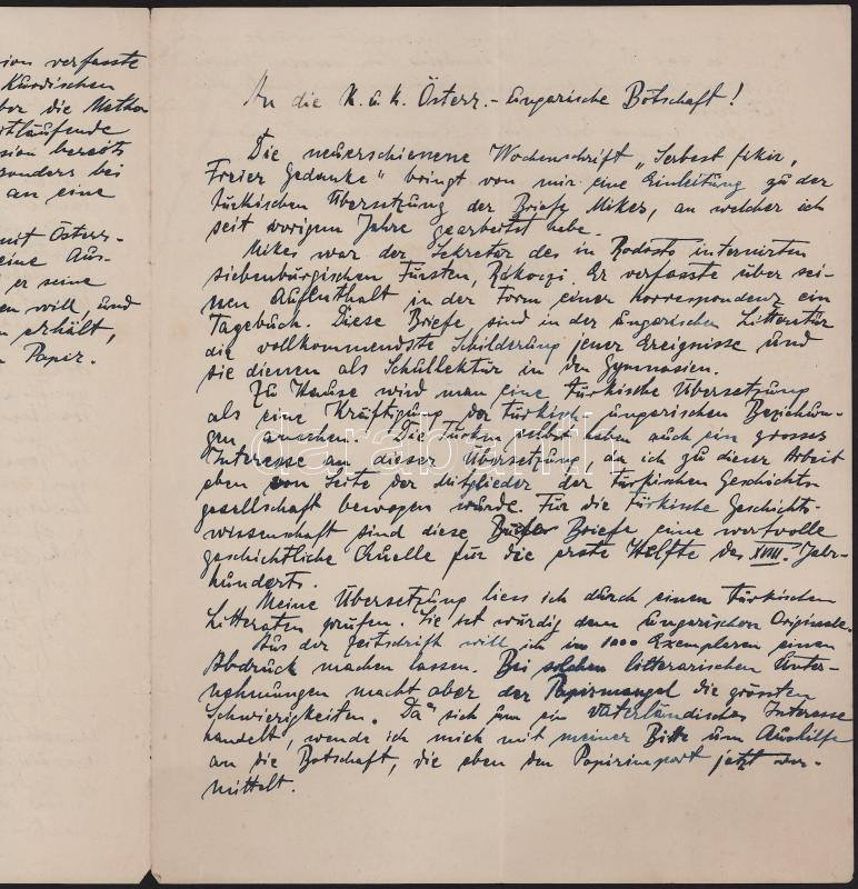 1919 Konst. Mosonyi Dénes Lipót (1874- 1948) nagyprépost, germanikus, kanonok, író. Német nyelvű levele Konstatinápolyi keltezéssel a helyi osztrák-magyar nagykövetségnek, melyben egy török szerkesztő oszrták-magyar kapcsolatokkal, pánszlávizmussal, pángermánizmussal kapcsolatos cikkét elemzi 4 beírt oldalon.