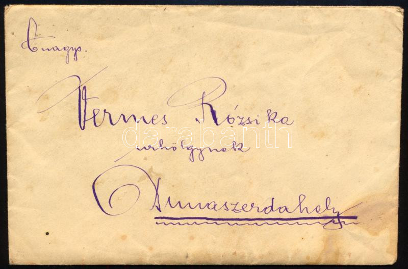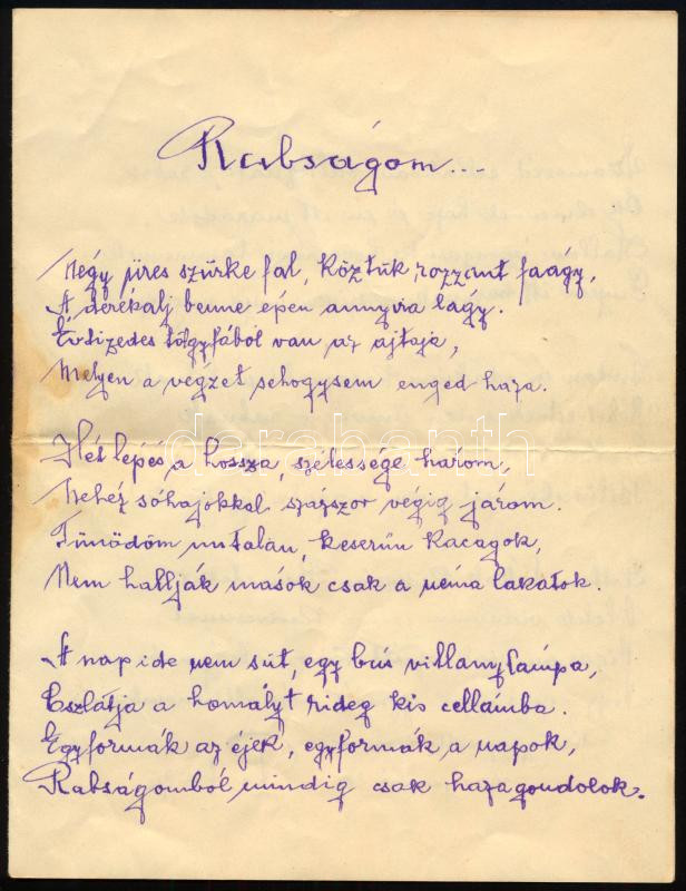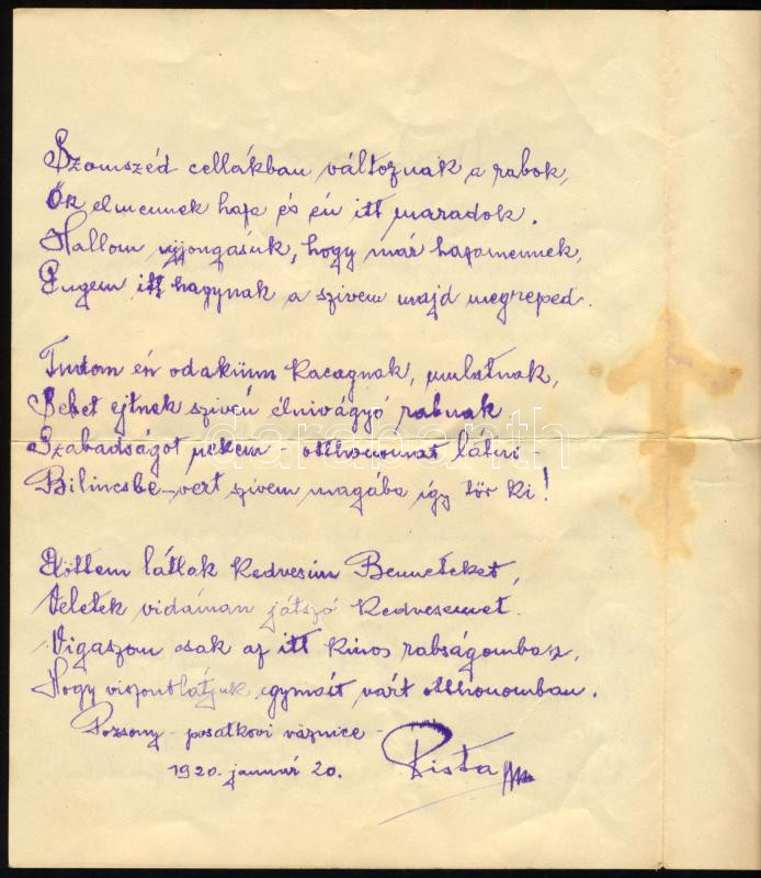 1920 Pozsony, Vermes István által Vermes Rózsikának Dunaszerdahelyre küldött levél, amely a pozsonyi börtönben való fogságáról beszámoló ,,Rabságom..." című versét tartalmazza. 1920 januárjában, 5 hónappal a trianoni békeszerződés megkötése előtt a már Csehszlovákia ellenőrzése alatt álló Pozsonyban számos magyar politikai fogoly raboskodott; feltehetőleg Vermes István, aki a szóban forgó versében beszámol a fogsággal járó lelki gyötrelmekről, is egy volt ezen politikai foglyok közül. Két beírt oldal, eredeti borítékkal. (A tételhez mellékelve egy részletesebb, A4-es oldal terjedelmű elemzés is.)