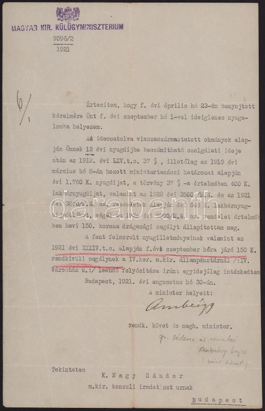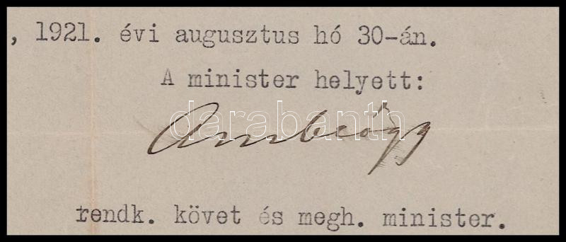 1921 Bp., sédeni és remetei gróf Ambrózy Lajos (1868-1945) diplomata, követségi tanácsos, meghatalmazott miniszter autográf aláírása külügyminisztériumi okiraton