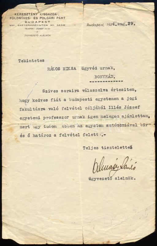 1924 Bp., Almásy László (1869-1936) politikus, jogász, a képviselőház elnöke autográf aláírása a Keresztény Kisgazda-, Földmíves- és Polgári Párt (Egységes Párt) fejléces levélpapírjára írt, gépelt levelén, kissé sérült lapszélekkel