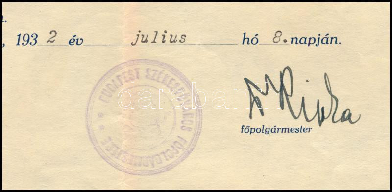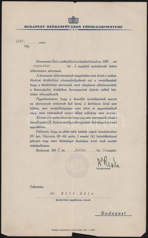 1932 Bp., Ripka Ferenc (1871-1944) politikus, Budapest főpolgármestere autográf aláírása dr. Bíró Béla orvos alorvosi kinevezésén, fejléces papíron, pecséttel.