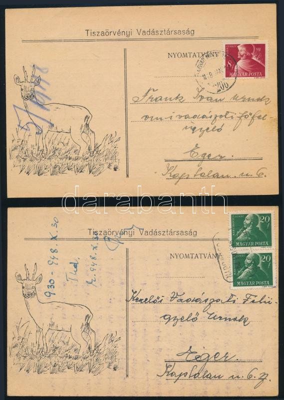 1948 A Tiszaörvényi Vadásztársaság 2 db meghívó levelezőlapja