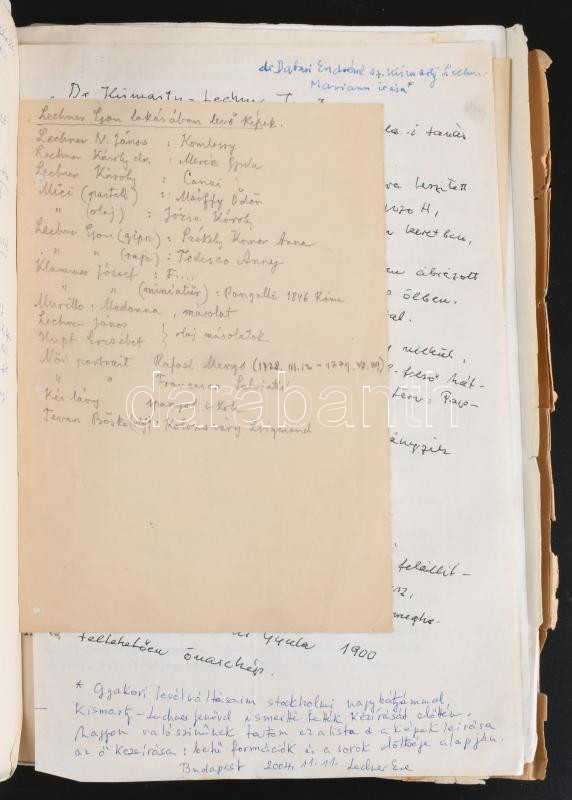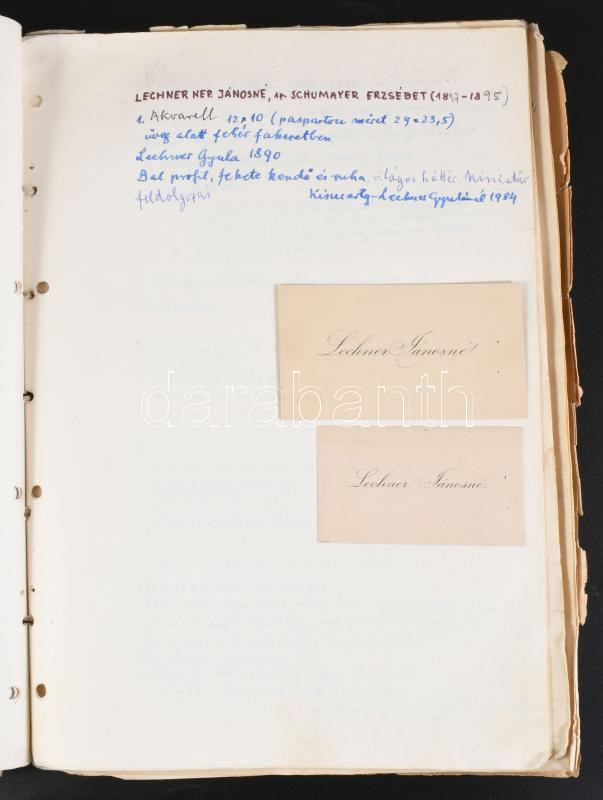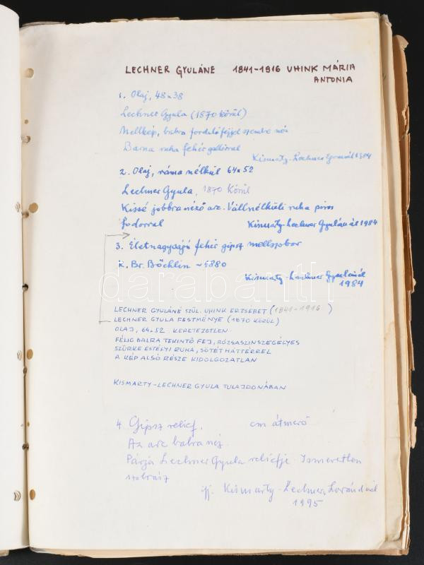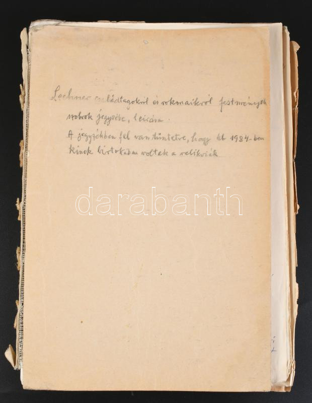 1984 A Kismarty-Lechner család tagjait és rokonokat ábrázoló fetsmények és szobrok jegyzéke, valamint annak leltára, hogy 1984-ben kinek a birtokában voltak a relikviák. ifj Kismarty-Lechner Lóránd összeírása kb 80-100 lap