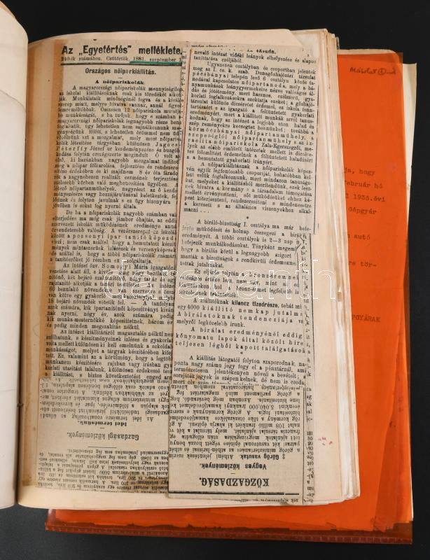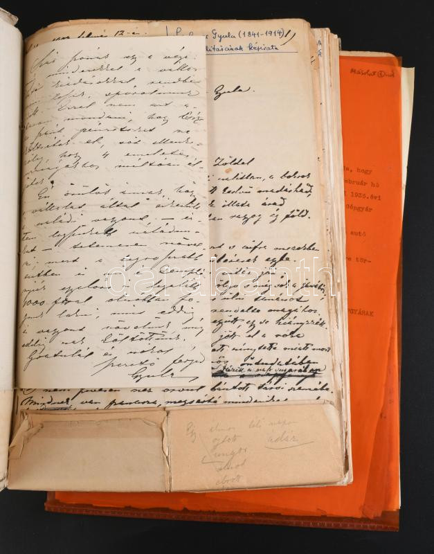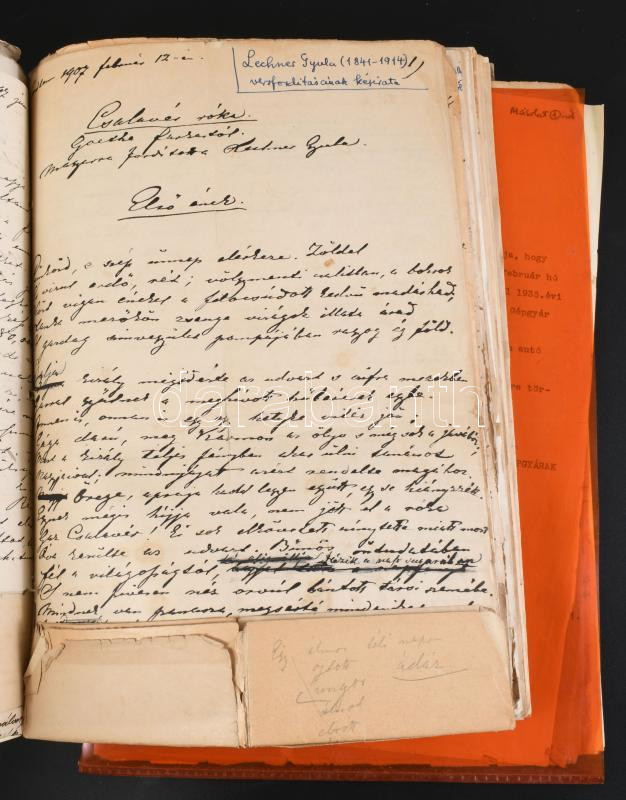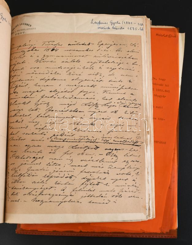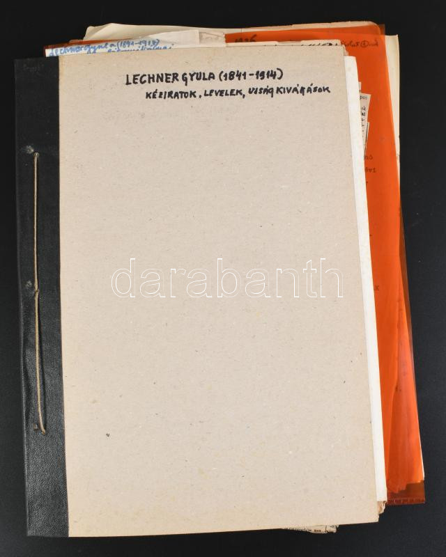 ca 1860-1914 Lechner Gyula (1841-1914) festőművész kézirat és okmány hagyatéka. Néhány kézirat, sok munkásságával kapcsolatos újságkivágás, stb. Kb 60 lap + néhány hasonló irat Lechner Lóránddal kapcsolatban