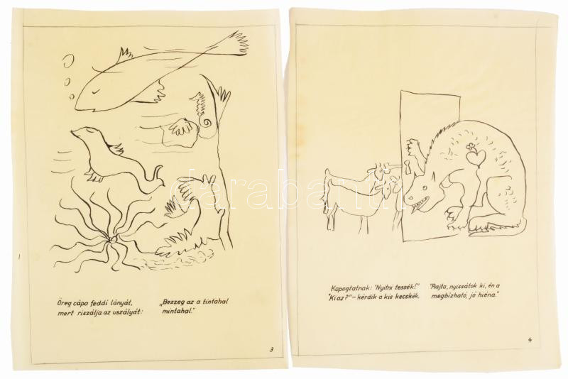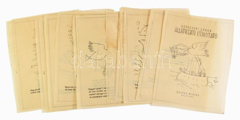 cca 1945 Devecseri Gábor: Állatkerti útmutató. Borsos Miklós rajzaival. A könyv 1945-ben megjelent első kiadásának terve (borító + 25 számozott oldal), egy kivételével mindegyik lapon Borsos Miklós illusztrációival. (A megjelent könyv terjedelme 52 oldal.) Nyomat, pauszpapír, egy kisebb lapszéli sérüléssel, helyenként kissé foltos lapok, 24x18 cm