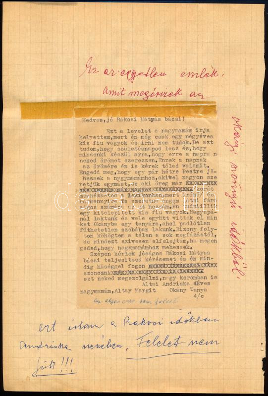 cca 1950 Altai (Altay) Margit (Altai Rezsőné, Gomperz Margit) (1881-1972) ifjúsági író által 4 éves unokája nevében Rákosi Mátyásnak írt levél, amelyben arra kéri, hogy unokája hozzá költözhessen az Okány községben található tanyáról, ahova családjával kitelepítették. Egy gépelt oldal, "Kedves, jó Rákosi Mátyás bácsi!" megszólítással. A levél papírlapra ragasztva, amelyen néhány későbbi, kézzel írt feljegyzés található (,,ezt irtam a Rakosi időkben Andriska nevében. Felelet nem jött!!!"). A levél alján és hátoldalán is feljegyzésekkel.