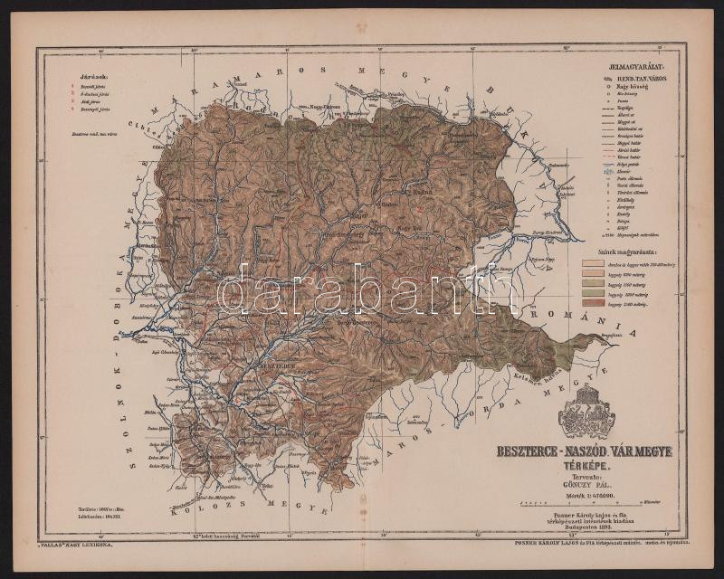 1893 Az erdélyi Beszterce-Naszód vármegye térképe, tervezte: Gönczy Pál, 1:47 000, kiadja: Posner Károly Lajos és Fia, Pallas Nagy Lexikonban közölve, jó állapotban, 24×29,5 cm