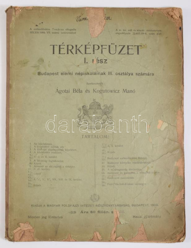 1909 Térképfüzet I. rész, Budapesti elemi népiskolák III. osztálya számára, szerk.: Ágotai Béla és Kogutowicz Manó, képekkel, színes térképekkel, 30p. Kissé sérült papírkötésben