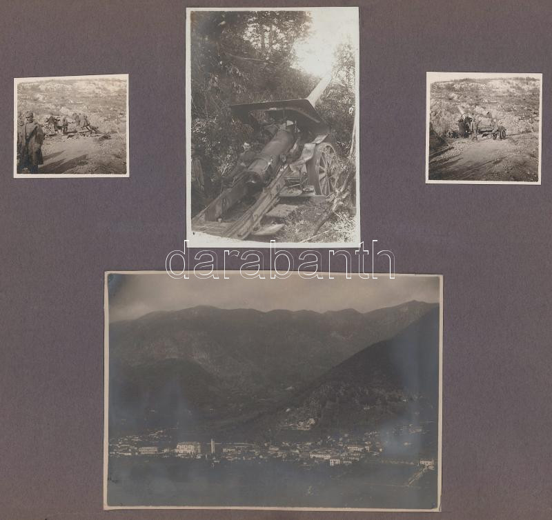 cca 1915-1918 I. világháborús felvételek az olasz frontról: osztrák-magyar ágyú, 30 és feles mozsár, romos templom, stb., összesen 12 db fotó, két albumlapra ragasztva, 4x5 cm és 12x16,5 cm között