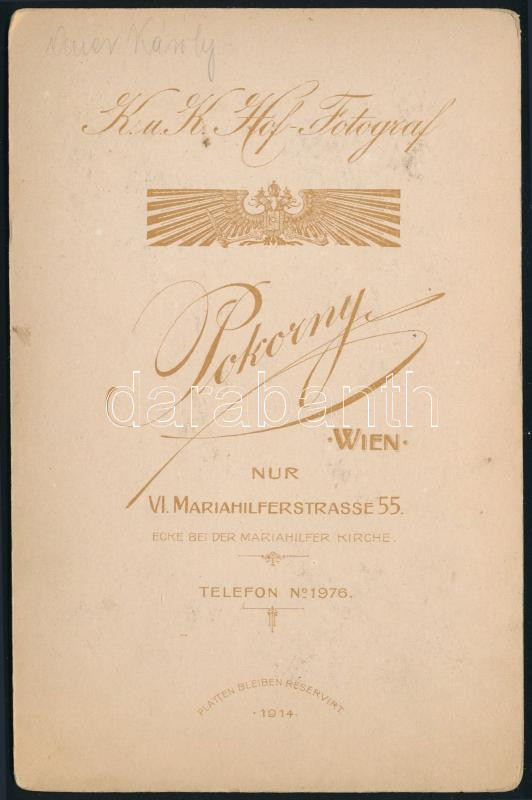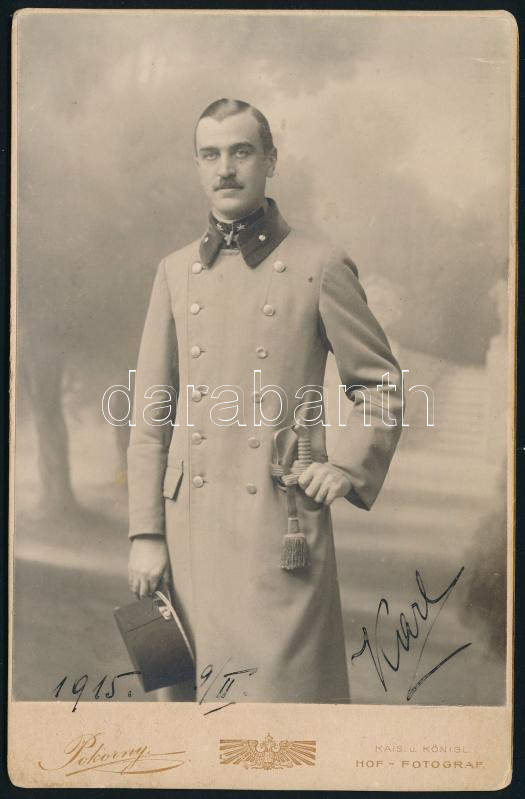 1915 Katonatiszt (Auer Károly) portréja, kabinetfotó Pokorny bécsi műterméből, feliratozva, 16,5x10,5 cm