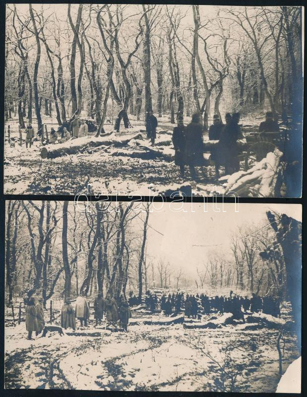 1915 Osztrák-magyar katonák egy havas erdőben Ašanja környékén (Szerbia), 2 db I. világháborús fotólap, 9x14 cm