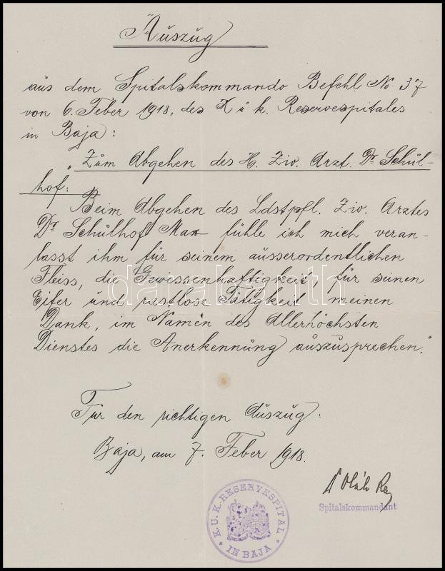 1918 Baja, K. u. k. Reservespital in Baja (bajai tartalékkórház) parancsnoka által kiállított német nyelvű irat Schulhof Miksa (1870-1945) izraelita vallású orvos részére, aláírással, bélyegzővel