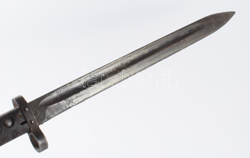 Csehszlovák CSZ bajonett, komplett, hüvellyel és bőr papuccsal, viseltes állapotban, h: 43 cm // Czechoslovak CSZ bayonet, complete, with scabbard and leather frog, worn condition, length: 43 cm