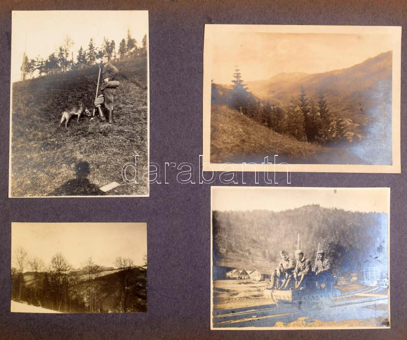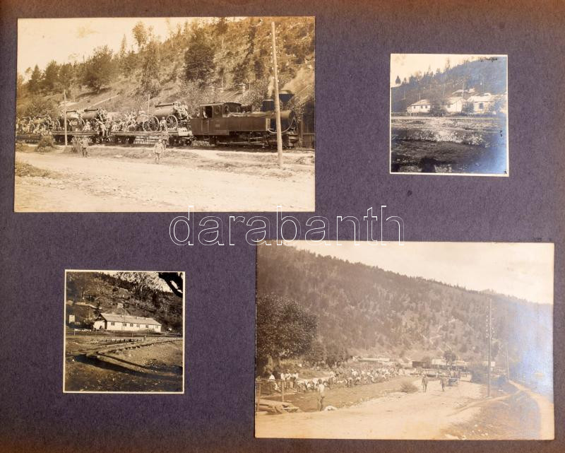 ca 1914-1918 I. világháború 107 db érdekes katonai fotó a frontról, járművek, vonat, autó, repülő, fehér zászló parlamenterek, stb. albumban, jó állapotban