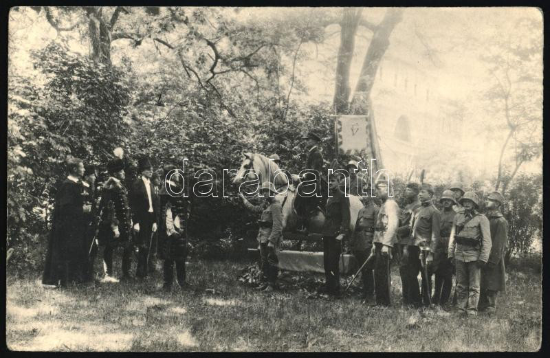 ca 1916 Darutollas katonák és díszmagyaros küldöttség találkozója fotólap