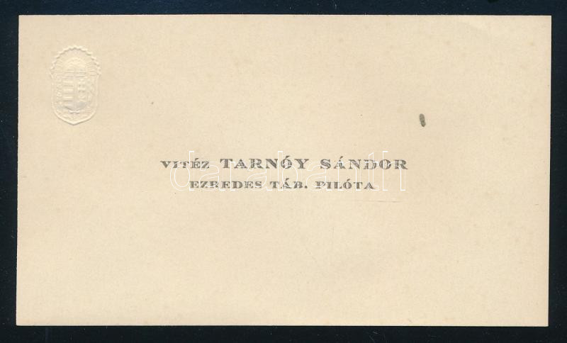 vitéz Tarnóy Sándor ezredes, táb. pilóta névjegye a dombornyomott vitézi címerrel