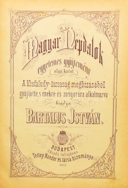 Bartalus István: Magyar Népdalok. Egyetemes gyűjtemény. Budapest 1873. Tettey Nándor és társa. 130p. Aranyozott festett egészvászon kötésben, kis kopással, gerinc ragasztott