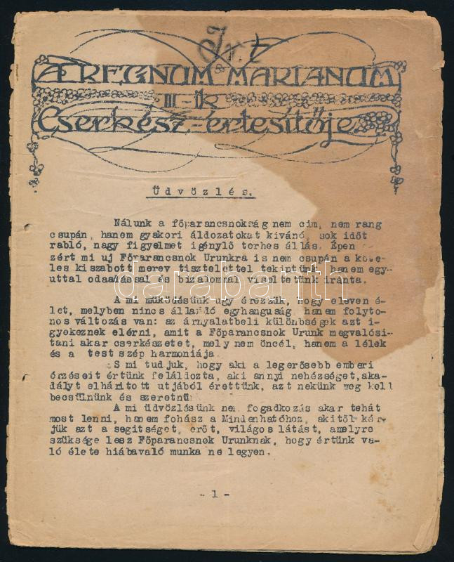 1920 A Regnum Marianum 3. cserkész értesítője 20 p. foltos, szakadással